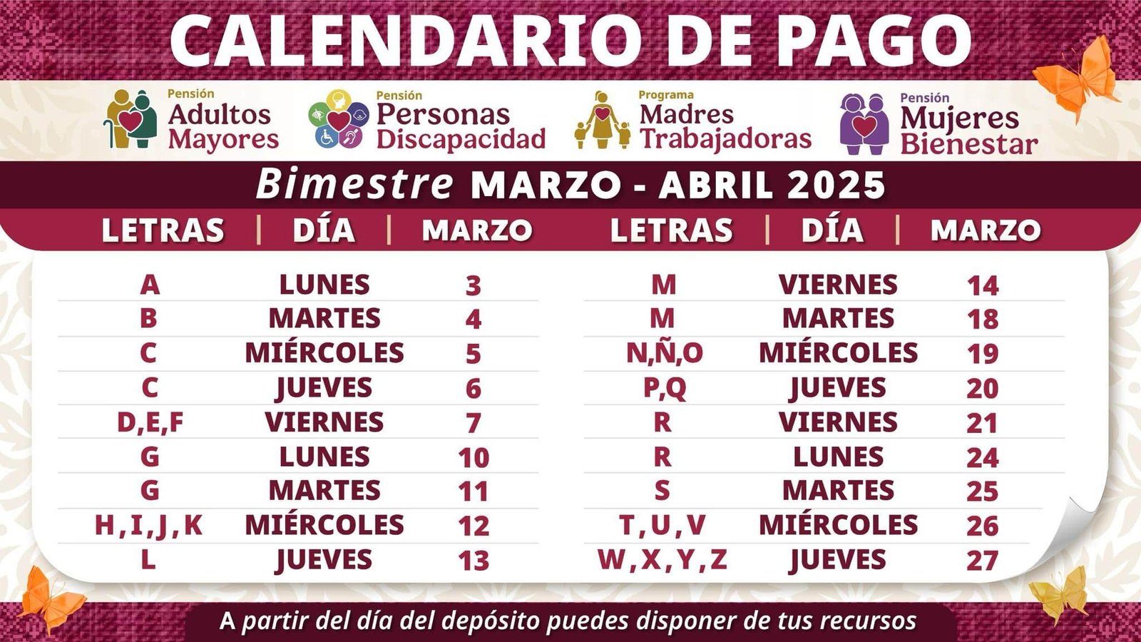 Hay que señalar que en el resto de México, los pagos de la pensión se realizarán conforme al calendario regular: así que el esquema de la entrega de los recursos se estará entregando a los Adultos Mayores, Personas con Discapacidad, así como de Madres Trabajadoras y Mujeres Bienestar, quienes estarán recibiendo los apoyos del 3 al 27 de marzo, y se mantendrá bajo el esquema de la primera letra del apellido.