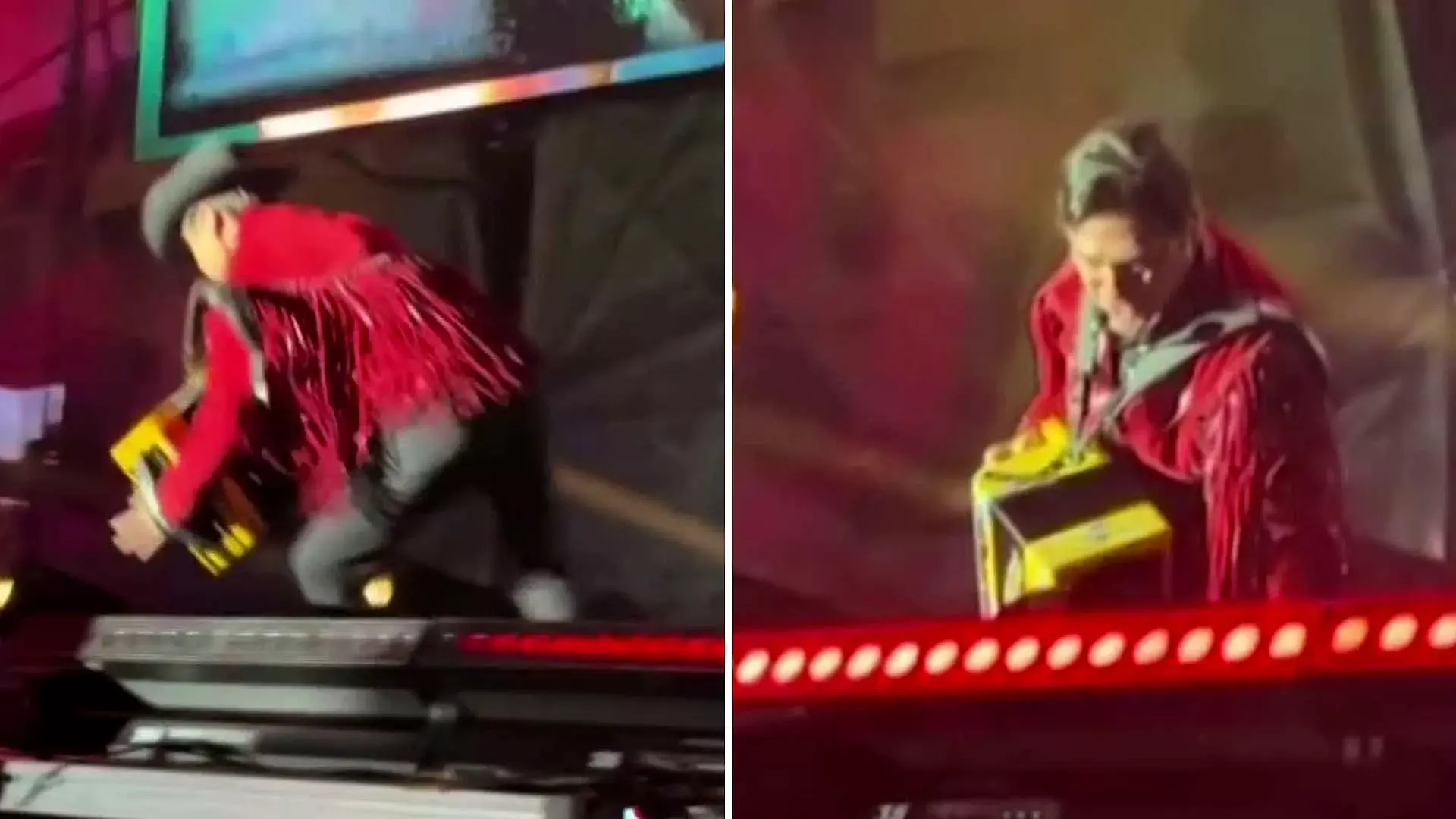 El incidente ocurrió la noche del 17 de agosto, frente a miles de asistentes que presenciaban el espectáculo de la reconocida banda norteña. En videos difundidos en redes sociales se observa al músico, de 72 años, caminar con su acordeón mientras vestía una chamarra roja y sombrero negro. De manera repentina, tropieza con parte de la estructura del escenario y cae de costado, golpe que incluso se escucha a través del micrófono.