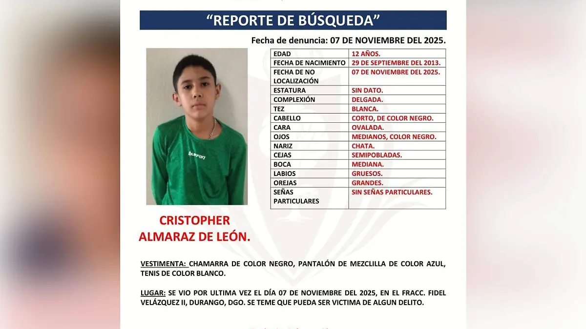La Fiscalía General del Estado de Durango emitió una alerta de búsqueda para localizar a tres menores de 12 años de edad que fueron reportados como desaparecidos en la capital del estado. De acuerdo con la información oficial, los niños fueron vistos por última vez el viernes 7 de noviembre en el fraccionamiento Fidel Velázquez II, sin que hasta el momento se conozca su paradero.